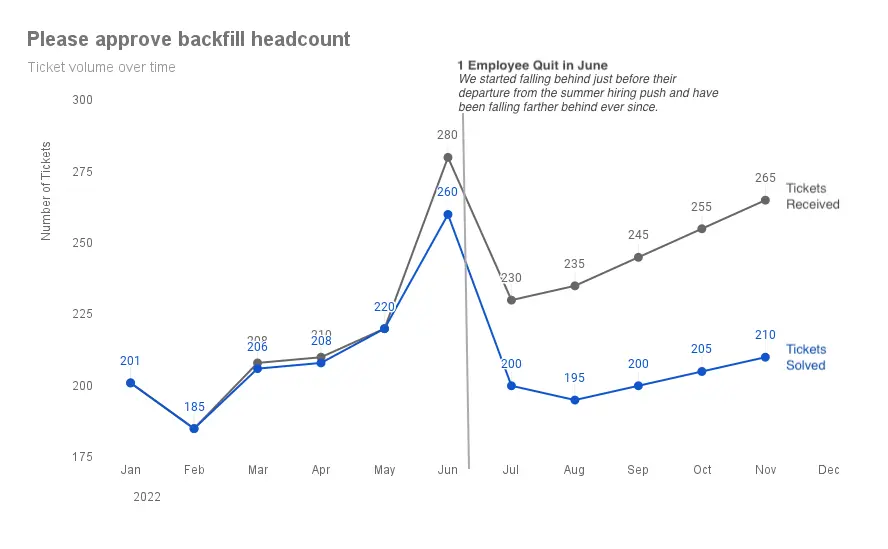 It’s basically the out-of-the-box default you get from Google Sheets. If you’re not colorblind, bright red and blue colors draw your eyes in, but that’s where it’s usefulness stops. Can you tell what I’m trying to convey in the chart?